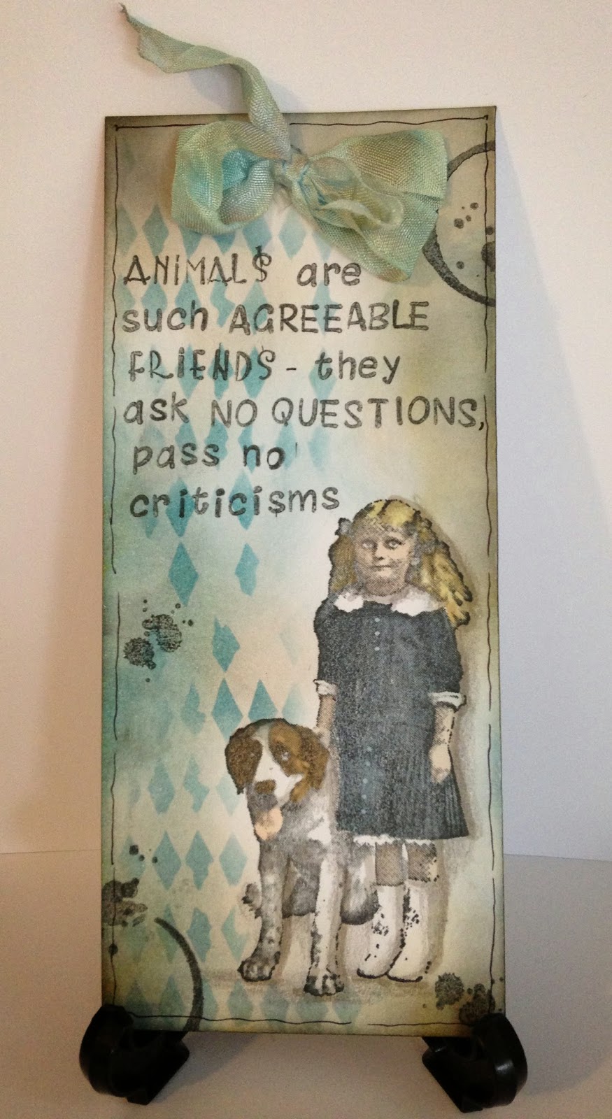Then using a Dylusions stencil I added some diamond pattern with more of the Broken China Distress Ink and a tiny bit of stamping with a Kaisercraft stamp. I added the quote using some mini alphabet stamps.