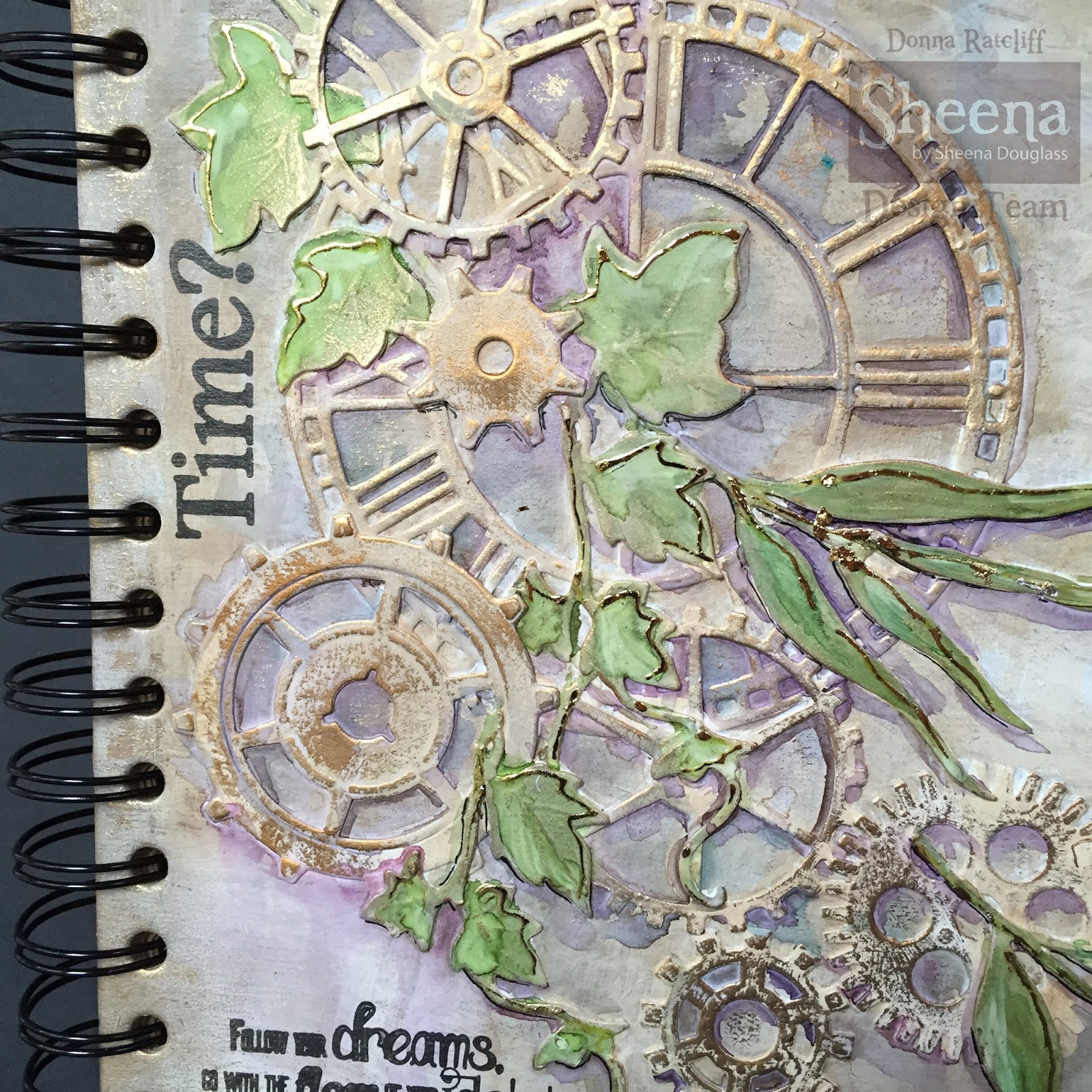 Now gilding wax; I've used the Empire Gold and Antique Gold from Pebeo and if you haven't used this before......less really is more with this wonderful stuff! You really don't use or need a lot so go sparingly! Its far better to build it up slowly :) So I took it over the cogs and lightly over the leaves which highlights the embossed veining nicely which hopefully you can see in this picture.....