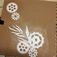 Right so first just to make life easier I carefully removed both covers, if you go gently you can do it without stretching the spiral binding too much and it certainly makes the decorating easier :) Then I grabbed a load of die cuts (from the Perfect Partner Time Traveller Range - All Geared Up and Make Time, from the Perfect Partner Country Cottage Range - Florists Friend and from the Perfect Partner Festive Fancies Range - Festive Ivy) and laid them on the cover, playing around with them until I found an arrangement I was happy with. Then I glued everything in place using tacky glue. Don't worry if your glue squidges out a bit because you're going to put a thin coat of gesso over everything so you won't notice it and its more important that everything is well stuck down. So now I had a front cover that looked like this....
